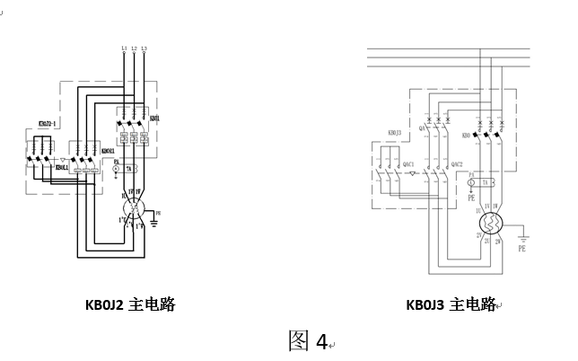 4. KB0J2、KB0J3、KB02J2、KB02J3主電路與普通KB0J、KB02J的接線方式區別是KB0或KB02主電路(lù)接(jiē)線(xiàn)位置,普通(tōng)的KB0J、KB02J接線方式:接在電(diàn)源進線端主電(diàn)路KB0承受的是線電流In。而采用圖4(KB0J2、KB0J3、KB02J2、KB02J3)分流的接線方(fāng)式後,KB0或KB02主回路接的位置有一些變化,啟動完成後主開關KB0或KB02承(chéng)受的是相電流In/3(見表(biǎo)4)。KB0J2、KB0J3、KB02J2、KB02J3全壓工作時(shí)流過每台主開(kāi)關的(de)相電(diàn)流的計算公式見表4。(電纜的截(jié)麵積選擇:引至電動機(jī)端(duān)的(de)電纜截麵積承載的電流不小於(yú)分流後,流過主開關工作電流值;引至星(xīng)三角減壓起動器進線端的(進(jìn)電源(yuán)端)電(diàn)纜截(jié)麵積承載的電流(liú)不小於電動機全壓工作時額定電流值。)